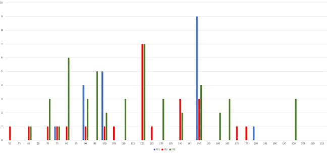 Pour effectuer cette figure, j’ai pris en compte les « erreurs » de relevé : un tempo de 148 relevé pourrait en réalité être un tempo de 150, plus conventionnel et utilisé sur plus de musiques en commun. Il existe donc une légère valeur arrondie dans les faits. De plus, une machine ou un programme ne fait pas de distinguo entre une mesure binaire ou ternaire. Ainsi, les tempi ternaires (6/8, 12/8 principalement) ont été ramené à leur valeur binaire. On peut également réduire la taille de cette figure si l’on remarque qu’il existe une corrélation entre les tempi à 50 bpm et 100 bpm, ou 70 et 140. En soi, les tempi doublés peuvent être ramené à une unique valeur, réduisant de ce fait les possibilités. En effet, programmer une noire à 140 bpm revient à programmer une croche à 70 bpm ou inversement, toutes les équivalences pouvant être valables. Ce faisant, nous obtenons la figure suivante :