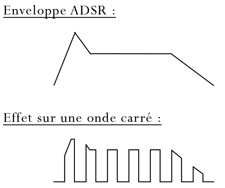 Schématiquement, cette enveloppe a cette forme, et j’ai ajouté en dessous son effet sur une forme d’onde carré. Bien entendu, les échelles ne sont pas respectées pour mettre en avant l’effet d’une telle enveloppe :